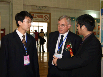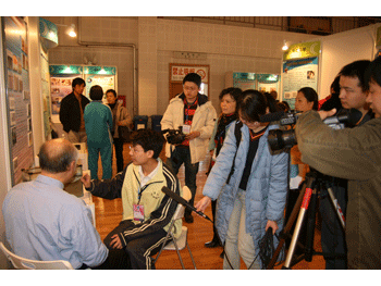 李文迪同学(坐者右)接受北京电视台采访 李文迪同学(左1)与外国来宾交流