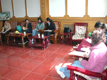 林静姿老师(左3)与区英语教研员、上庄二中教师等座谈 徐蓉老师(正面左2)与区数学教研员、上庄二中教师等座谈