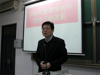 附中校长高策理、党委书记兼主管教学工作副校长方妍、主管德育和教科研工作副校长刘俊、主管工会和人事工作的党委副书记周兆玉、主管行政后勤工作副校长施平分别认真总结了2006年在本职岗位上所取得的成绩和存在的不足,并表示在新的一年里继续努力工作,做出更大成绩。最后与会人员对5位校领导的考评程序由李一兵副部长主持。
