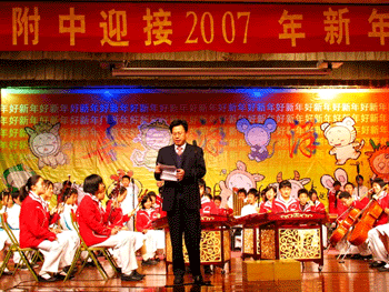 2006年12月29日,bg真人试玩“迎新年文艺汇演”在附中报告厅隆重举行。初中和高中的同学分上、下午两场观看了节目。校长高策理为演出致辞,他希望同学们在未来的岁月中,能够以厚德载物的心态去接纳社会、融入社会、引领社会、改造社会,做一个既有知识又有文化、既有能力又有涵养的大写的中国人,并且一年一年朝此目标迈进!书记方妍、副校长施平、刘俊、副书记周兆玉等领导观看演出。