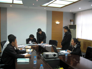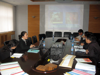 附中党委书记方妍(左2)汇报工作 方妍书记(右1)、林冬梅老师(右2)回答检查团问题
