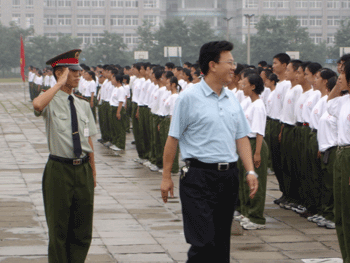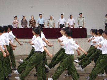 在开营仪式及授旗仪式上,刘俊副校长和军训营营长分别作了动员讲话。在9天紧张的训练中,同学们从教官那里学会了怎样整理内务,培养了在艰苦的训练中吃苦耐劳的革命精神,并且感受到了军队严明的纪律和无私的奉献精神。同学们还将自己的爱国热情和军训中的种种感受倾注到军训快报以及精忠报国歌咏比赛等文艺活动中。各个班级形成了班集体凝聚力。军训期间,高一合唱团组建,合唱团员们在紧张的军事训练同时也进行严格的声乐训练。德育主任杜毓贞和老师们还一起为在军训期间过生日的同学举办了别开生面的生日祝会,大家都为其中的浓浓深情所感动。联欢会上,同学、老师和军队的教官们一起表演节目,共欢乐,全场气氛无比热烈,师生之间,军民之间感情充分融合。在8月30日上午举行的军训营表彰大会暨闭营式上,同学们以昂扬的精神面貌冒雨进行了军事汇演,附中校长高策理、党委书记方妍、副书记周兆玉、副校长刘俊、德育主任杜毓贞、高一年级组长俞家新等出席并观看。高策理校长还检阅了军训营方阵。学校领导以及部队首长给予高度评价。会上,对军训中各方面涌现出来的优秀集体和个人进行了表彰。
