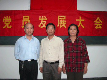 俞家新和两位介绍人胡雷(左)、李增玲(右)合影 党员发展大会后全体合影
