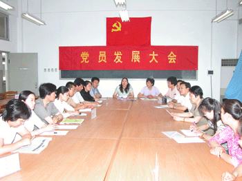 陈红老师主持党员发展大会 罗春霞老师(右)介绍对向丽老师的组织考察情况