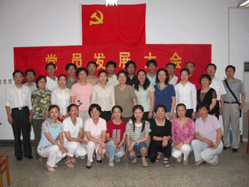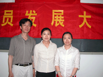 向丽和她的入党介绍人周建国(左)文磊(右)老师合影 参会的全体党员合影