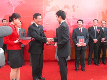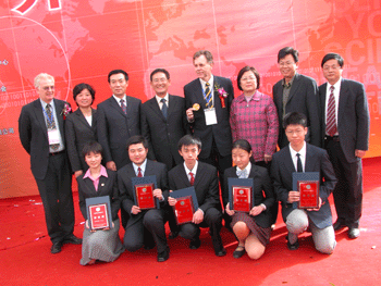 范伯元市长向我校学生朱若辰(前右1)颁发“市长奖” 范伯元副市长(后左4)、马歇尔教授(后右4)等