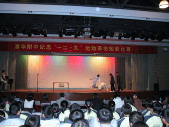 12月8日下午,由附中团委组织的纪念“一二·九”运动革命短剧比赛在附中报告厅隆重举行。附中党委书记方妍、副校长刘俊、德育处领导杜毓贞、黄丽梅以及心理中心、艺术中心、年级组及其他评委老师参加了大会,清华大学团委的米佳老师应邀出席大会。
