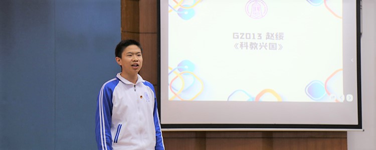 赵绥同学带来了《科教兴国》。他伫立于讲台之上侃侃而谈。从古论今,上有拿破仑,下至近现代。自信流利的表达使他“科教兴国”的观点更具说服力。孙阅微评委对他的表现赞叹不已。
