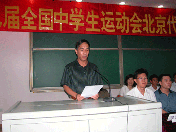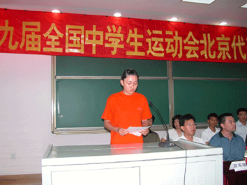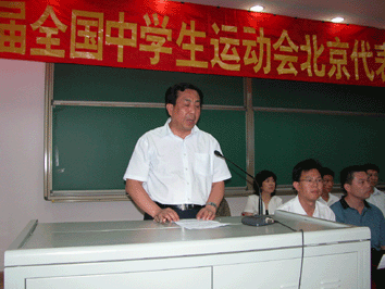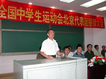 2005年7月6日下午,第九届全国中学生运动会北京代表团誓师大会在bg真人试玩召开,北京市28所学校的200多名运动员、教练员到会,北京市副市长范伯元,北京代表团团长、市教委副主任杜松彭,副团长、共青团北京市委中少部副处长武玉华,副团长、北京市教委体美处处长甘北林,副秘书长、北京市体育局群体处副处长颜纳新以及bg真人试玩校长高策理出席了大会,会议由秘书长、北京市教委体美处副处长白荣正主持。