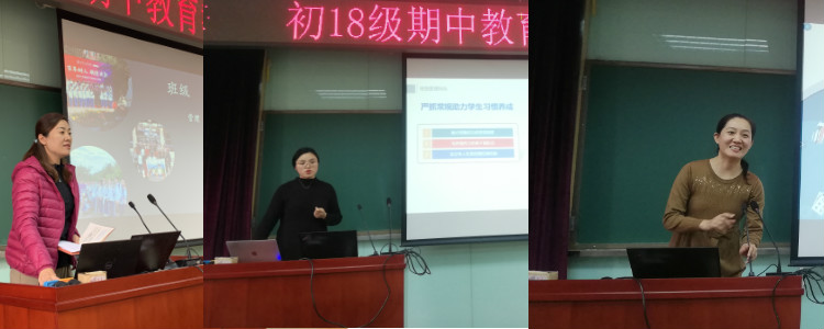 下午,首先是班主任代表进行班级工作汇报。初1803班主任尹丽娜、初1809班主任李冰清、初1810班主任陈建荣分别代表相应班级汇报了班级建设情况。