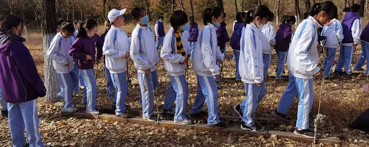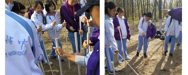 有轨电车是对团队协作的挑战。每组队员全部站在两块木板做成的大板子上,将左右脚分别放入木板上的绳套中,双手拉住木板上的短绳,全体队员穿着这双“大木板鞋”完成教练指定的路线。队员们喊着口号,整齐的迈出左脚或右脚,迅速完成了任务。这项挑战让同学们更加深刻理解了个人和团队的关系,理解了和谐一致对集体的重要性。不倒森林、齐头并进同样考验了同学们团队的协调与统一能力。
