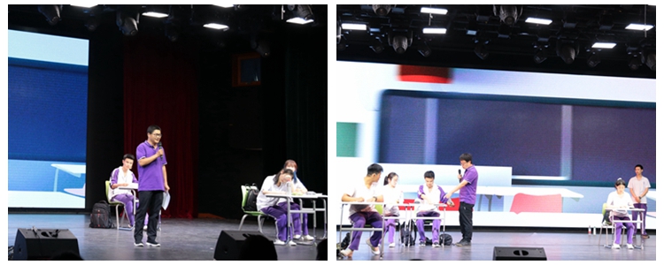 生物组梁姝颋老师展现了考前为学生加油打气的场面;政治组于洺老师在最后一课与学生留下最美师生合影;历史组关劲松老师以博学笃定的姿态,为学生诠释“英雄”的定义,鼓励学生迈出校门,成为自己人生的英雄。最后班会课演绎环节,语文组汤莉老师以“为二十年后的自己写信”为内容,带领学生铭记与展望。期间,年级组长李劲松老师,年级助理李明娟、武晓青老师,语文组唐洁老师,深情款款,用诗歌诉说对高18级学子的爱与期待。至此,整个舞台剧表演环节告一段落,学生在沉浸式的体验中重温、回忆,开怀、感动。
