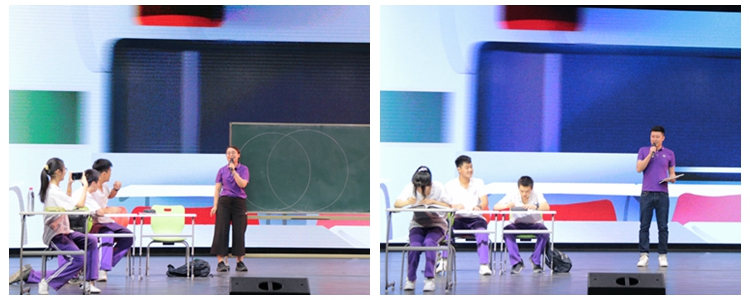 整个毕业典礼以展现高三年级学生在校一天学习生活的舞台剧为整体创意,邀请了各个学科的教师代表参与演出,艺术地再现了高考前夕各科教师个性十足、金句频出、殷切真挚的嘱托。英语杨依霖老师以诙谐幽默的方式寄语学生学习贵在坚持;数学李新萍老师展现了最后一课应试策略的叮嘱;体育荆传涛老师带领大家再现课间操高三加油会场景,并于此环节颁发了高三年级学科和德育年度奖项,重温高三年级师生一年的辉煌与璀璨。物理郎君轶老师用轻松的语调道出了对学生的希望,拥有一个有趣的灵魂,活出人生的意义;地理姚佳老师以徒手画圆的绝活征服学生,并祝愿学生画好人生之圆;化学白传江老师为学生做了大学生涯规划,希望学生真正走到生活中去,并热爱生活。