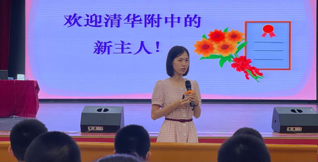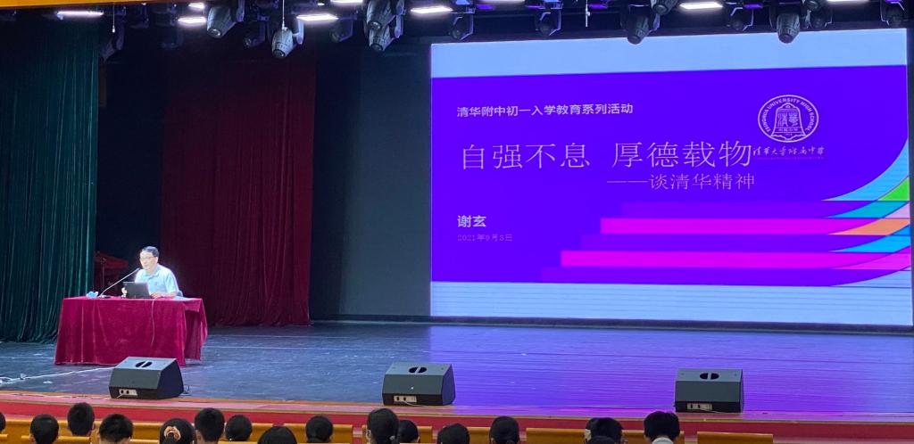 之后,谢玄老师介绍了清华大学历史上的重要代表人物。他着重提到了梁启超、陈寅恪、冯友兰、马约翰等清华大学的杰出代表,号召初一新生学习他们治学穷理的为学精神和为国为民的爱国精神。此外,谢玄老师还提到了“王静安先生纪念碑”中的最后几句——“惟此独立之精神,自由之思想,历千万祀,与天壤而同久,共三光而永光”,深深震撼了全场师生,点燃了初一新生的理想之光。