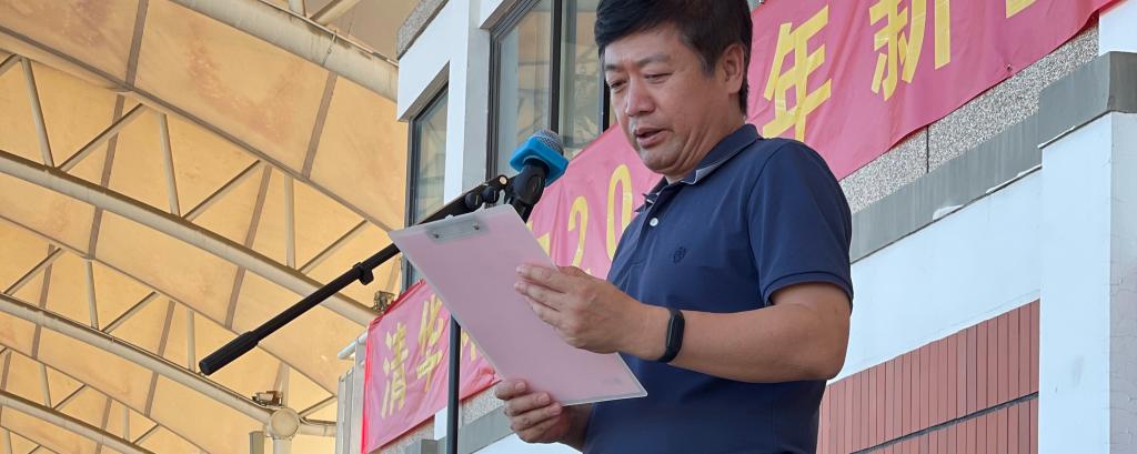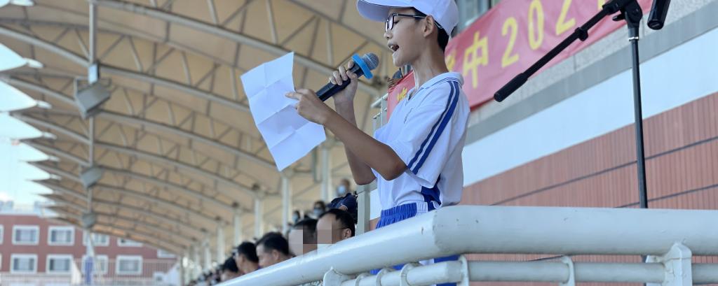 检阅完毕后,初21级14班袁博作为学生代表上台发言。他代表初21级全体学生,表达了对学校、年级组、教官和老师们的感谢,并立志以钢铁般的意志扛起使命和责任,成为报答母校、报效祖国的一代附中人。