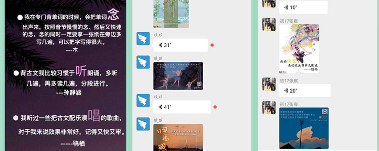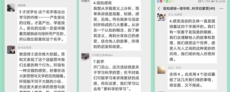 活动充分应用了学习科学中多项策略进行创新设计。在开营仪式以及每日活动中,对比、类比策略反复应用,帮助学生看见自己,认识他人,开放包容、积极热情。在阅读交流以及晚间播报环节,活动将“反馈”设计成学习任务,实现了及时反馈以及同侪反馈。活动同时配备美工组将产出内容进行视觉化呈现,极大增强了微信群线上学习效果。结营仪式上共创活动名称的设计任务带领全体学员回顾整体学习过程,并且思考活动的内涵和意义,为全体参与者留下了深刻印象。
