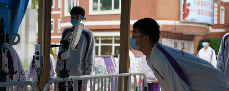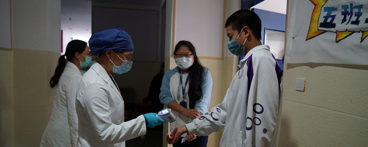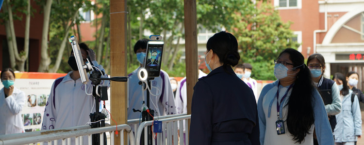 学生排队测量体温正常后入校