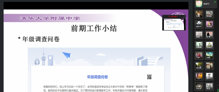 教学管理与研究中心尹粉玉主任培训全体教师使用清华考试平台的方法以便更高效地应对线上统测,并通过学校空中学堂学生线上学习的数据分析,言有所据地为高三教师提供一模前教学的指导意见。