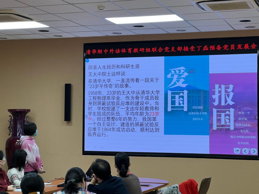 第三部分是理论学习。支部党员尹然老师通过“23岁半传奇”故事,介绍了清华大学王大中院士的事迹。丁磊同志分享了自己学习《中国共产党第十九届中央委员会第六次会议》精神的体会。在理论学习之后,所有与会党员和教师分享参加本次预备党员发展和转正大会及理论学习的体会和感想。入党积极分子周维纬表示,能够参加今天的发展大会使自己深受鼓舞。作为入党积极分子,她将始终以党员的标准来要求自己,不断提升自己,争取早日成为一名光荣的共产党员。