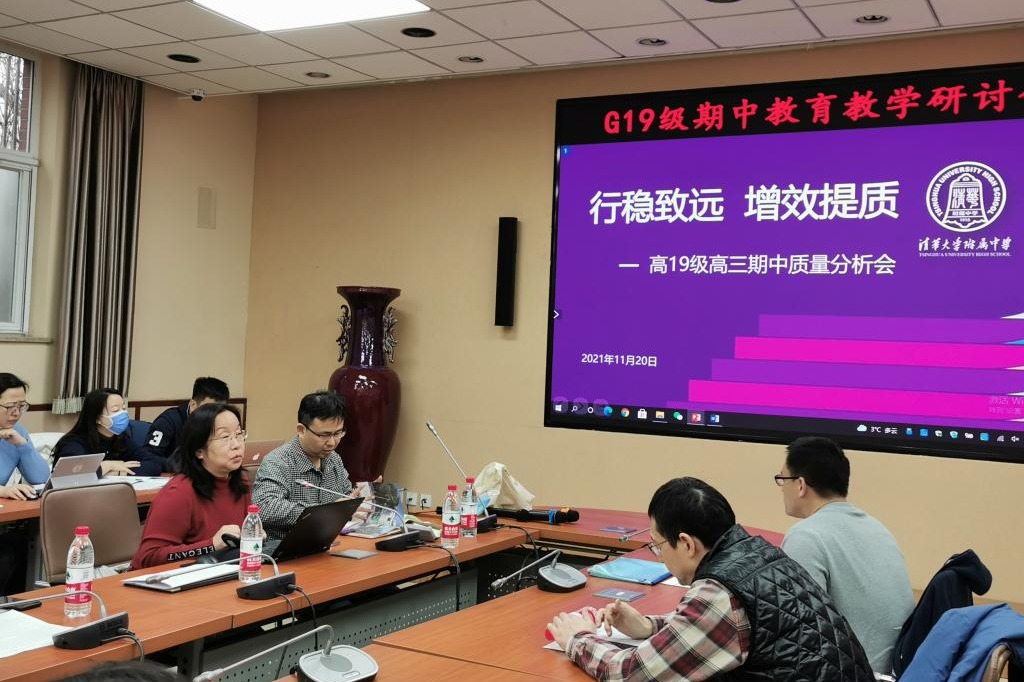首先,教学管理中心主任尹粉玉分别从海淀期中命题设计、学校期中成绩通报、问题反思、工作建议四个方面作了汇报,深刻细致地分析了此次期中考试成绩情况,并给出了针对出现问题的具体工作改进措施。