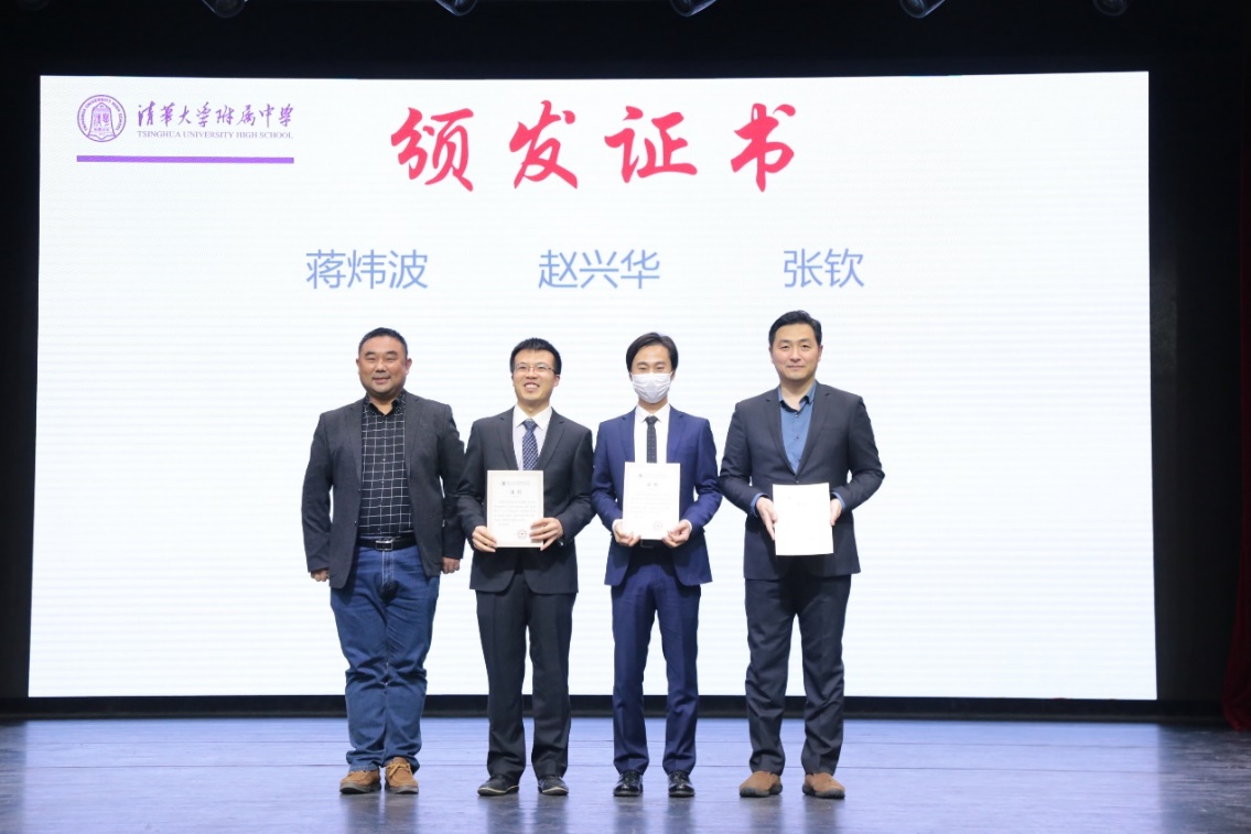 海淀区学科德育项目组赵岩老师(左一)为蒋炜波(左二)、赵兴华(右二)、张钦(右一)颁发证书
