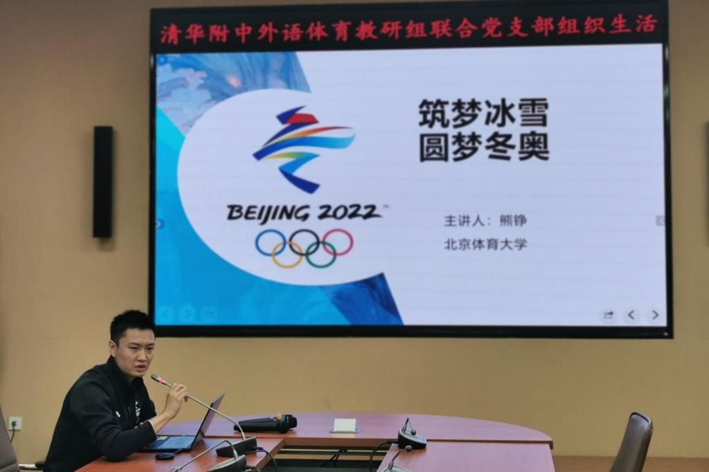 随后,附中党委副书记张洁进行发言。她对两位宣讲嘉宾的到来表示欢迎和感谢,同时高度评价了支部联系共建这种主题学习形式。她指出,外语体育教研组联合党支部在组织学习冬奥宣讲活动中具有得天独厚的优势,应当发挥自身作用,积极为宣传冬奥作贡献。