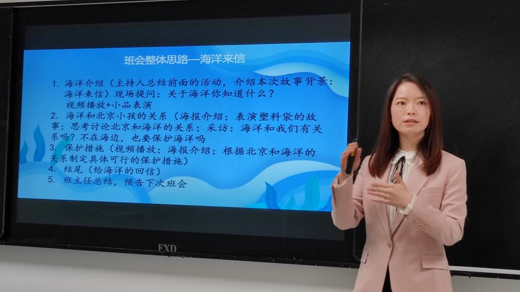 此次班会主题为海洋保护,一封海洋来信贯穿班会始终。首先,海洋信使介绍了海洋的重要性;之后学生们表演了小品《塑料袋奇遇记》,讲述了来自北京的塑料袋漂洋过海缠到太平海龟身上的故事,学生们讨论了北京和海洋的关系,学生们思考能为海洋保护做哪些事。最后,范皖晴老师总结,把海洋保护和学生们与人交往相结合,并预告了下一次“环境保护”班会课的主题。