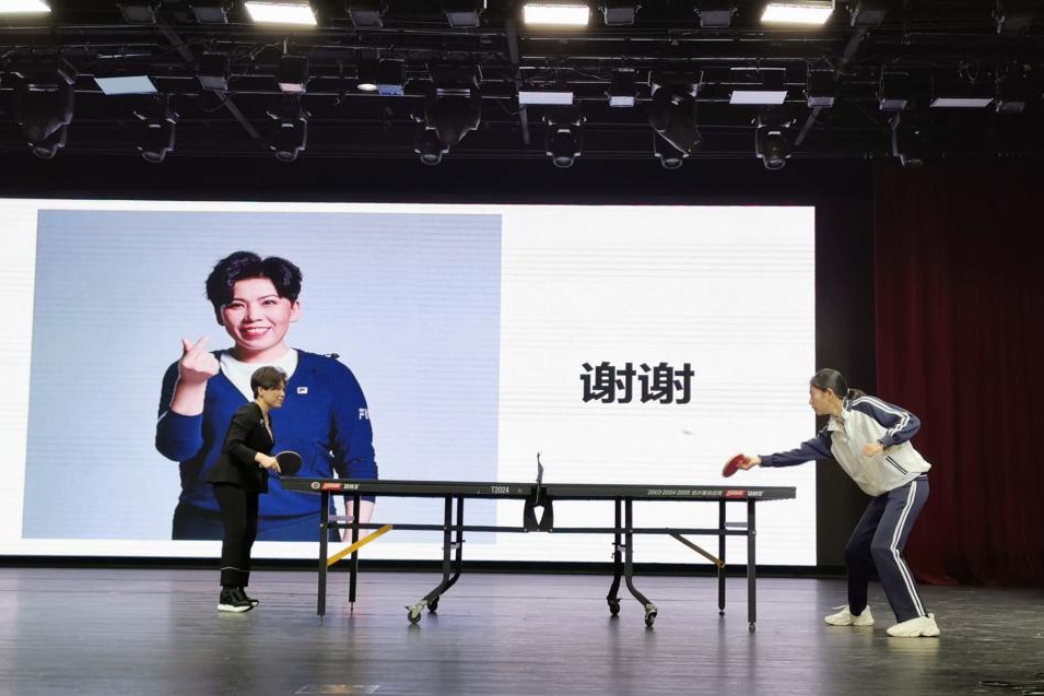 邓亚萍和学生代表交流球技