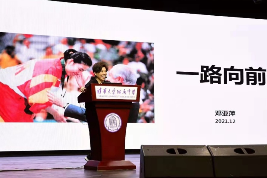 2021年12月20日,bg真人娱乐高三年级邀请奥运冠军、乒乓球大满贯得主邓亚萍为高三年级全体师生作主题为“一路向前”的专题讲座。bg真人娱乐党委书记方妍,副校长白雪峰,教学与管理中心主任尹粉玉,学生发展中心主任李书霞,以及全体高三师生参加了本次讲座。高三年级组长周建军老师主持讲座。