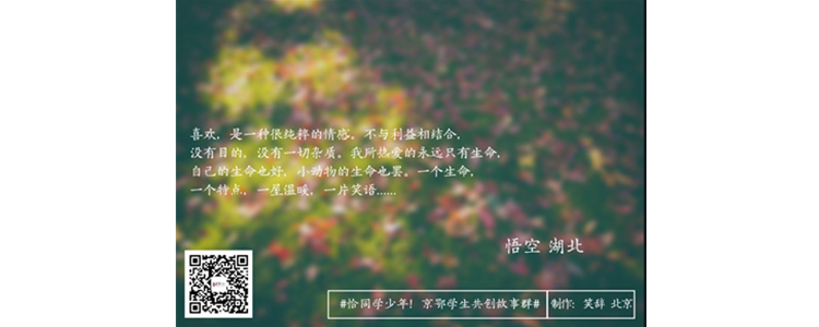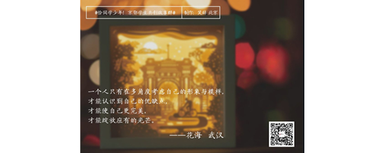带着如此初心,同时借助互联网打破地域间的区隔,bg真人娱乐学生发展中心发起了“恰同学少年——京鄂学生共创故事群”活动(后文简称“恰同学少年”活动),为青少年量身打造一个自由而轻松的表达空间,结合成长类的课程学习与话题讨论,鼓励同学们在深度的自我探索以及与同龄人的对话、共写中,获得个人的成长与集体的陪伴,给宅家的日子增添温暖和力量。