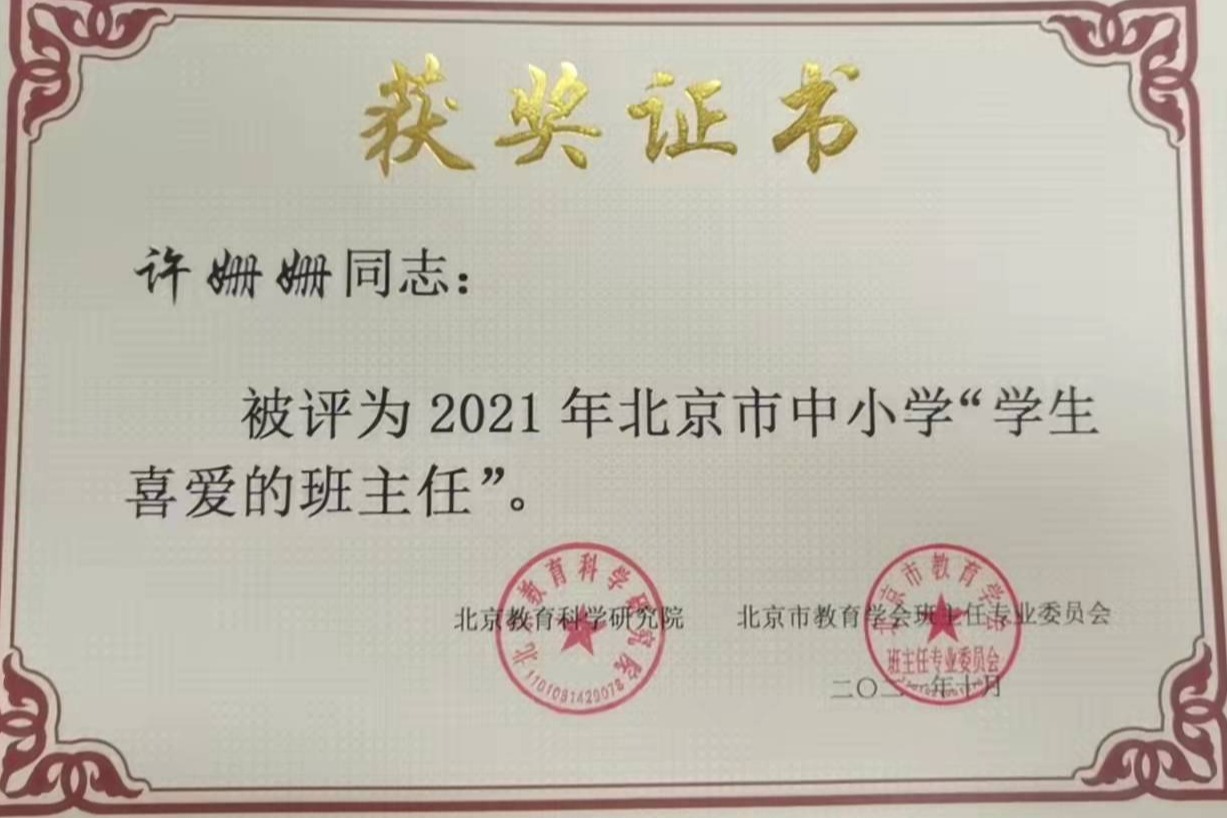 许姗姗老师荣获2021年北京市中小学“学生喜爱的班主任” 荣誉称号