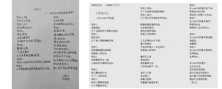 此外,初18级语文备课组以“致英雄”为主题,引导学生进行诗歌创作,用文字记录那些不平凡的事迹,传承英雄的精神,抒发内心的感悟。