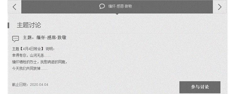 4月4日上午9点30分,初1803班在空中学堂召开了时长20分钟的《缅怀 感恩 致敬》的哀悼日线上主题班会。本次班会分为两个部分,在第一部分播放了由蒋理和刘玥佳同学录制的视频以,视频为同学们讲解了“下半旗”的相关规定以及抗击新冠肺炎牺牲的烈士事迹,同时号召同学们积极参与“全国哀悼”活动。在班会的第二部分,10点整全体同学参与哀悼活动,默哀致敬。默哀结束后,同学们回到空中学堂班会的主题交流区分享了自己的感受,同学们用文字缅怀烈士。通过本次主题班会,提高中学生爱国热情,培养并践行爱国主义情怀。