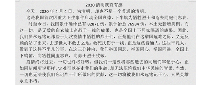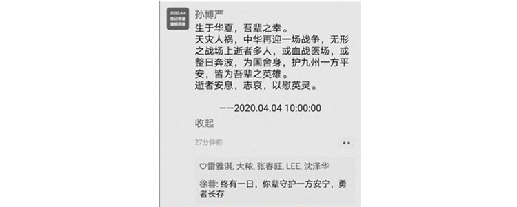 2020年4月4日清明,物至此时皆以齐洁而清明矣,桐始华、虹时见、田鼠化为鹌。在这样历经寒冬而再次春暖花开的日子里,我们缅怀先烈、追思逝者,为所有停留在寒冬的同胞默哀,向抗击新冠肺炎疫情的英雄致敬。