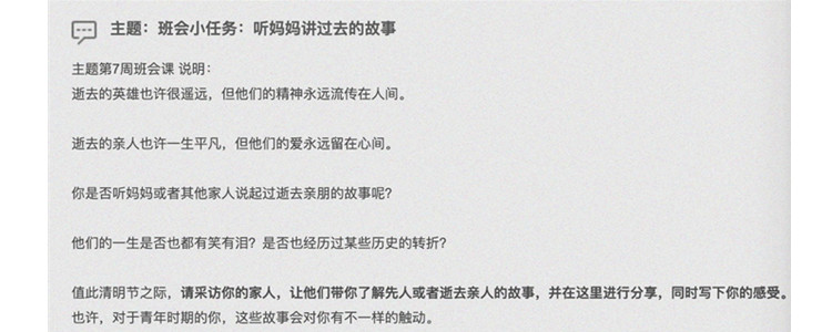 初1809班利用本周的班会时间,请学生们采访了自己的家人,让他们带自己了解先人或逝去亲人的故事,并在班级讨论群内分享,以此缅怀逝去的亲人,感受平凡生命的可贵意义。