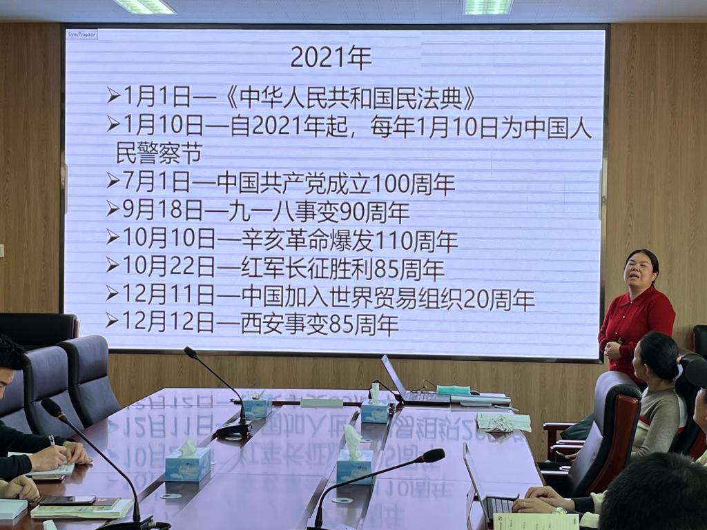 本次组织生活的第一部分是党支部书记讲党课。支部书记黄丽梅结合2021年具有纪念意义的日子(如《中华人民共和国民法典》的正式实施和中国共产党成立100周年)和2021年十大重要事件,深入剖析历史事件和重要新闻背后所传递的信息,引导全体党员进行正确解读。