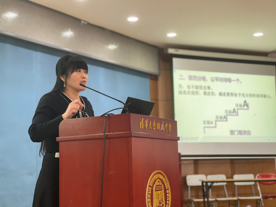 首先,宋美娜老师以“赞美的力量”为主题,分享丰富的班主任工作经验。学生性格大不相同,不变的是发现学生闪光点毫不吝啬地给予赞美。赏罚分明时,也得注意公平对待。班主任通过培养学生领袖,召开系列主题班会,联结家委会、图书馆及学校等各类组织,为学生搭建各种成长平台,保护孩子好奇心,引导孩子兴趣点逐步落地生根、发芽成长,习得各种新方法新途径让学生在有幸福感、仪式感的班级氛围中自信快乐成长。“不要急、不要比、多观察、多倾听、多赏识”,是宋老师最真诚的叮咛。