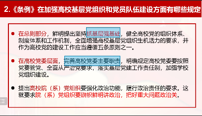 初中英语党小组代表分“条例简介”、“条例主要内容和解读”和“以问题深入学习条例”三个版块分享了党小组对《中国共产党普通高等学校基层组织工作条例》主要内容的解读和学习体会。