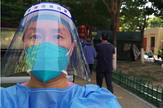 肖娜老师作为社区志愿者,进行核酸检测引导。