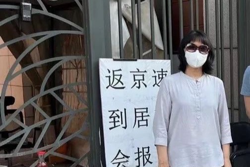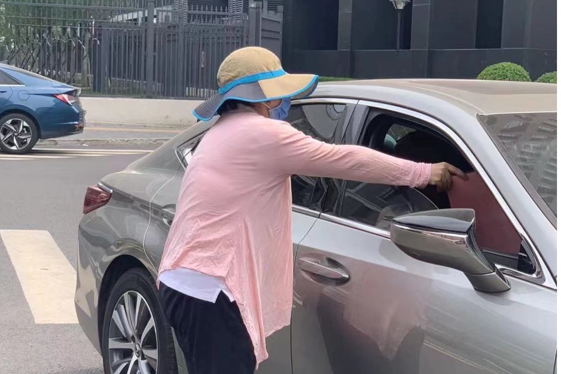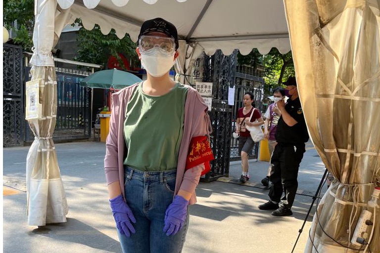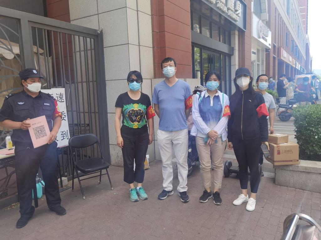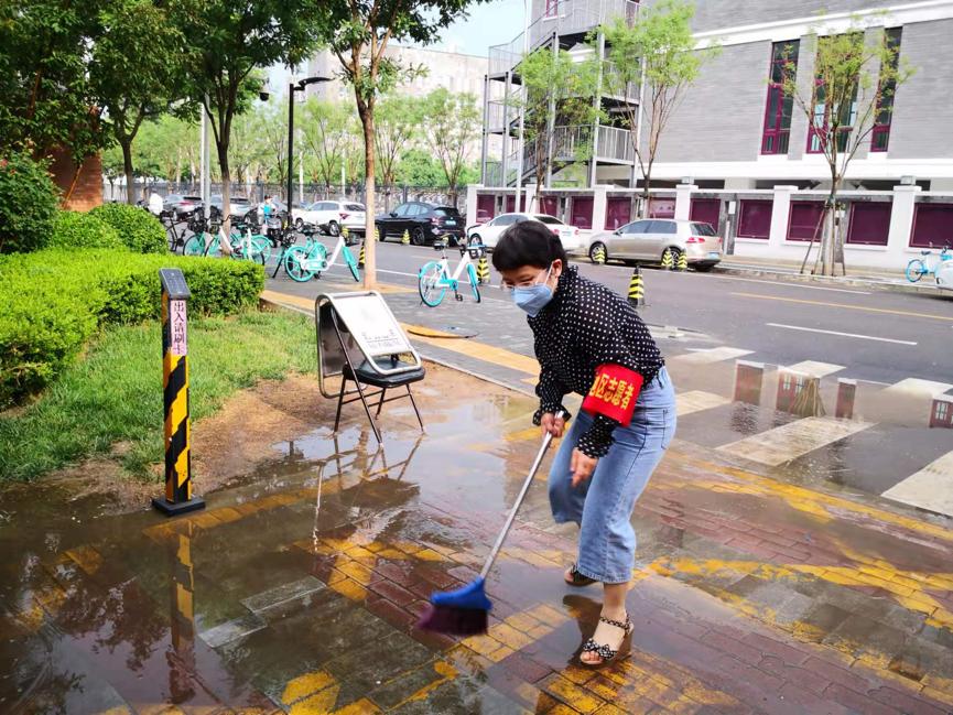 5月24日下午,白建娥老师担任双清苑小区东南门志愿者,负责提醒进入小区的人员扫描北京健康宝并清理地面积水。