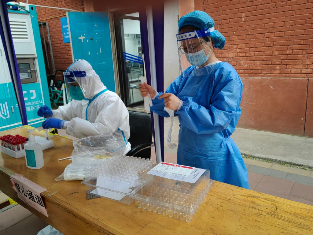 熊学勤老师在社区志愿核酸采样辅助服务。