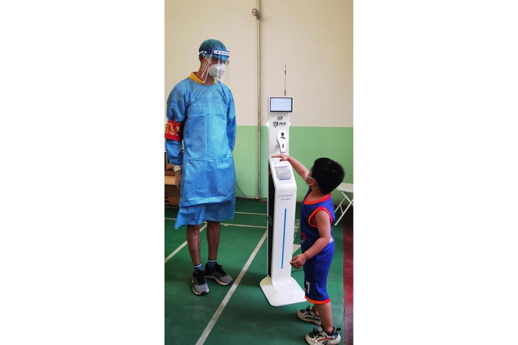 王田老师在西南社区做志愿者,负责进门的测温和维持秩序。