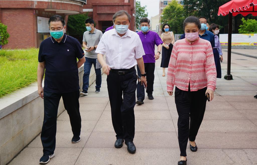 王方(中)实地查看校园,王殿军(左一)、方妍陪同检查(右一)