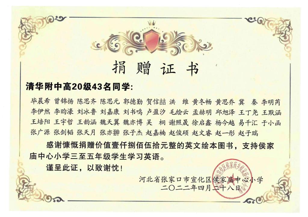 侯家庙乡中心小学为慷慨捐赠的附中学子发来了捐赠证书,小学生们也为附中的哥哥姐姐写了感谢信、制作明信片来表达感谢。