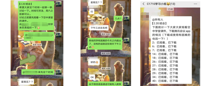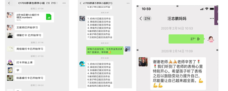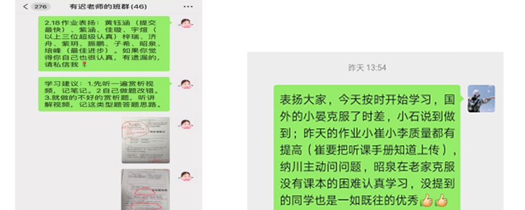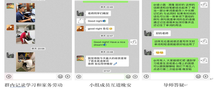借助小组保证学生在家期间可以维持规律的学习生活。由老师和同学共同监督,维持特殊时期正常的学习节奏。班主任及导师及时掌握学生动态,并与家长反馈交流。