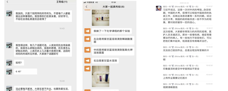 通过一周的网上学习,各个学习小组在年级、班级的统筹组织下,发挥学习小组体量小,联系更紧密的优势,灵活机动地开展着每天的活动,并且每周由导师引领,进行小组内的网络讨论,话题涉及学科知识,生活锻炼,疫情防护等各个方面。