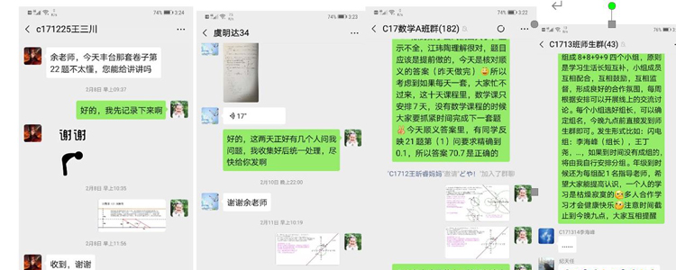 在“停课不停学”的号召下,为了更好的促进师生及学生之间的交流,帮助学生解决学习上、生活中的各种困惑和问题,初17级各班在进行网上学习的同时,结合本班学生实际情况和特点,把班级学生分为小组,并邀请本班任课老师作为小组同学的学习和生活导师。班主任整体统筹,使得班级活动和教育活动灵活进行,并能有机结合,开合有度。各科任课老师担任导师,也体现了全员德育的教育理念。虽然同学们身在家里,但彼此通过学习小组——班级、导师——班主任这种模式,让距离不复存在,班级凝聚力不断壮大。