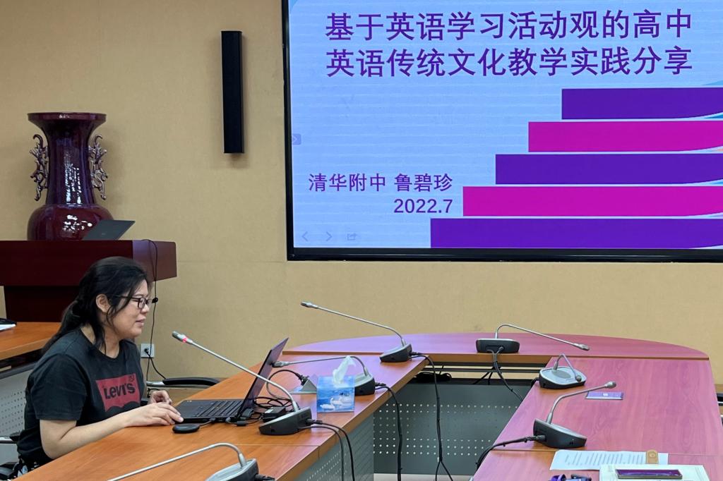 高中英语党小组代表鲁碧珍老师就《基于英语学习活动观的高中英语传统文化教学实践》做了分享。鲁老师从如何进行教学设计、如何激发学生兴趣和如何将传统文化有机融入于英语课题进行了讲解,并向大家展示了学生作品。