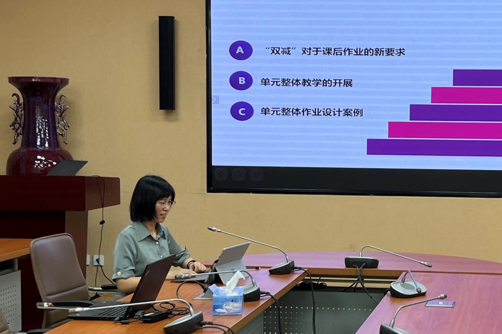 本次学习的第二部分是由各党小组的代表就如何在新时代要求中落实立德树人的教育目标进行分享。初中英语党小组的曹佩老师就如何在“双减”背景下,基于单元整体设计理念进行作业设计进行分享。曹佩老师从双减政策对作业提出的新要求出发,结合本组参加市级比赛的作品,介绍了初中英语组如何就“双减”和新课标精神进行教研。