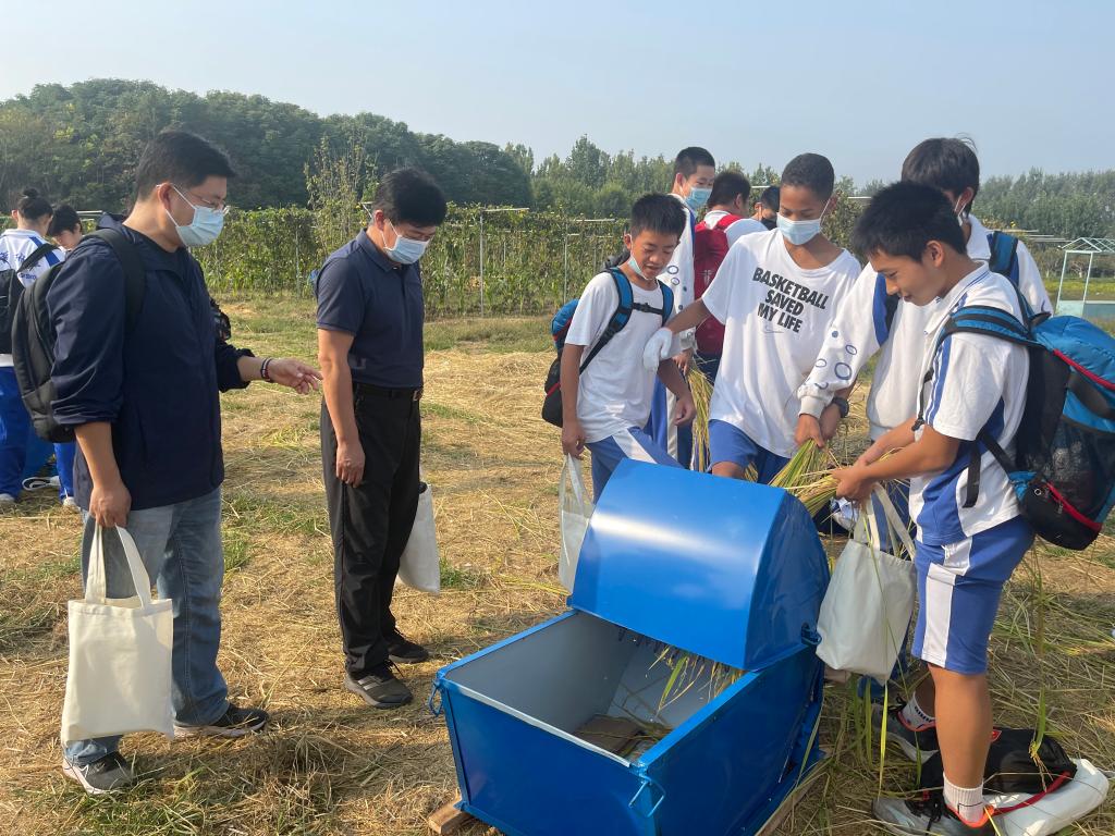 收割完稻谷,指导老师带着同学们体验了打稻谷穗。老师传授了两种手工脱粒方法——纯动手将稻米砸下和用人力机器将谷粒打下。用机器脱粒需要同学们之间默契的配合、踩踏踏板时的力量以四肢的协调能力。最终每个小组都成功将稻谷脱粒完毕。